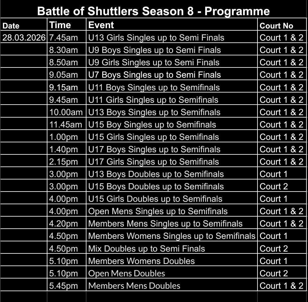 Please find the Day 01 Match Schedule for 28th March 2026. Kindly be present at the venue at least 30 minutes before your match time.